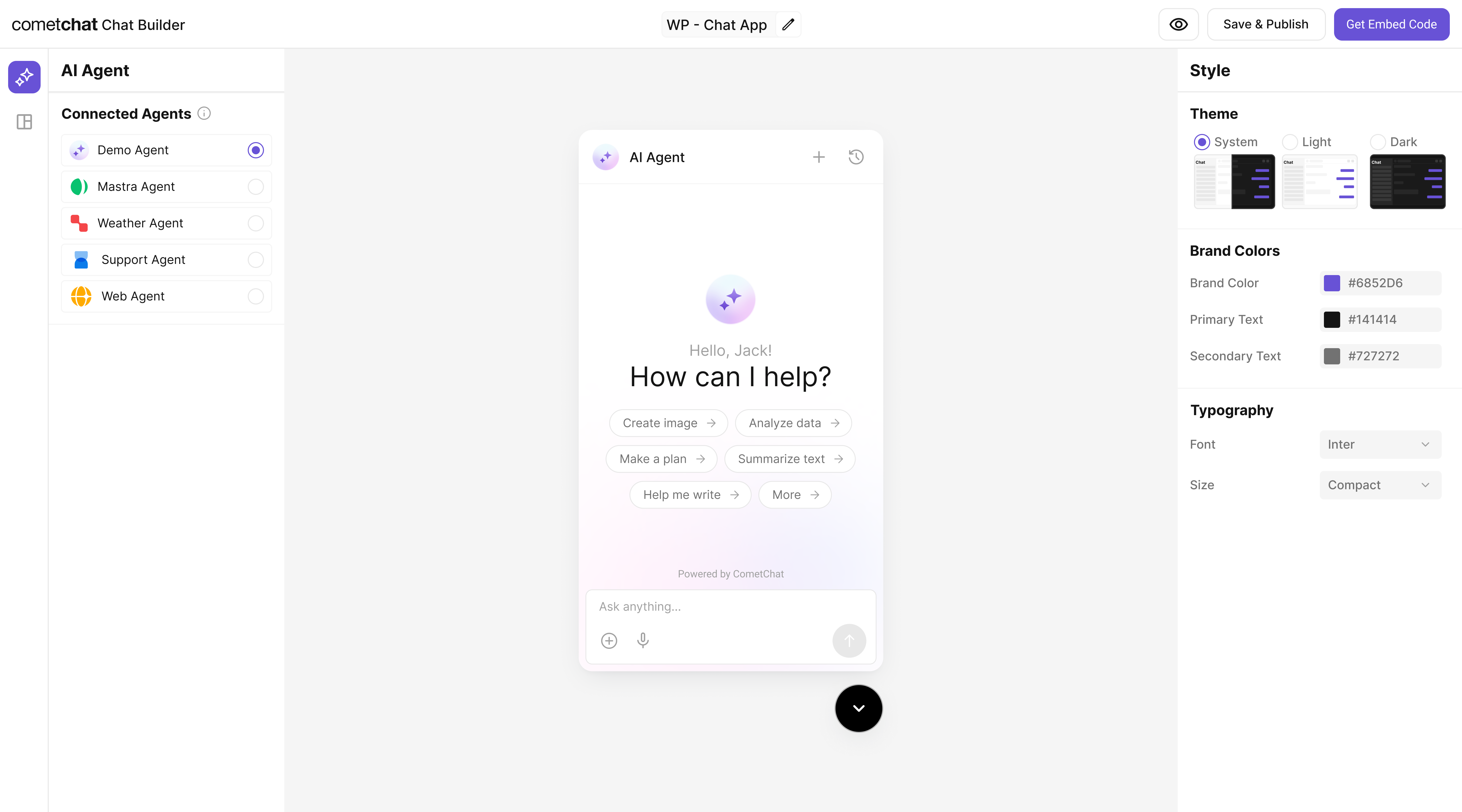 Once your agent is configured, you can integrate it into your app using the CometChat Widget Builder