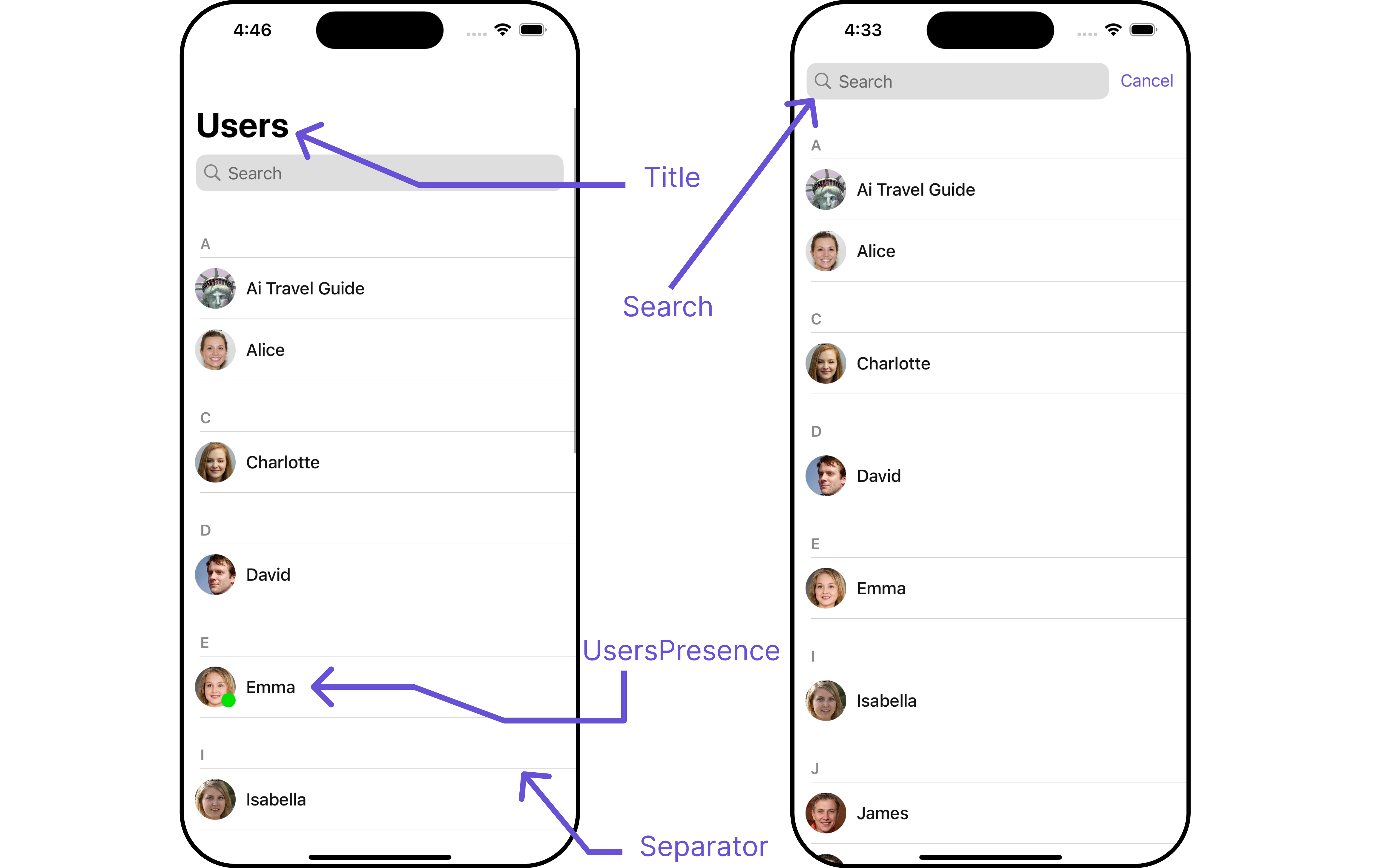 | Hide Separator | Used to hide the divider separating the user items | .hide(separator: Bool) |