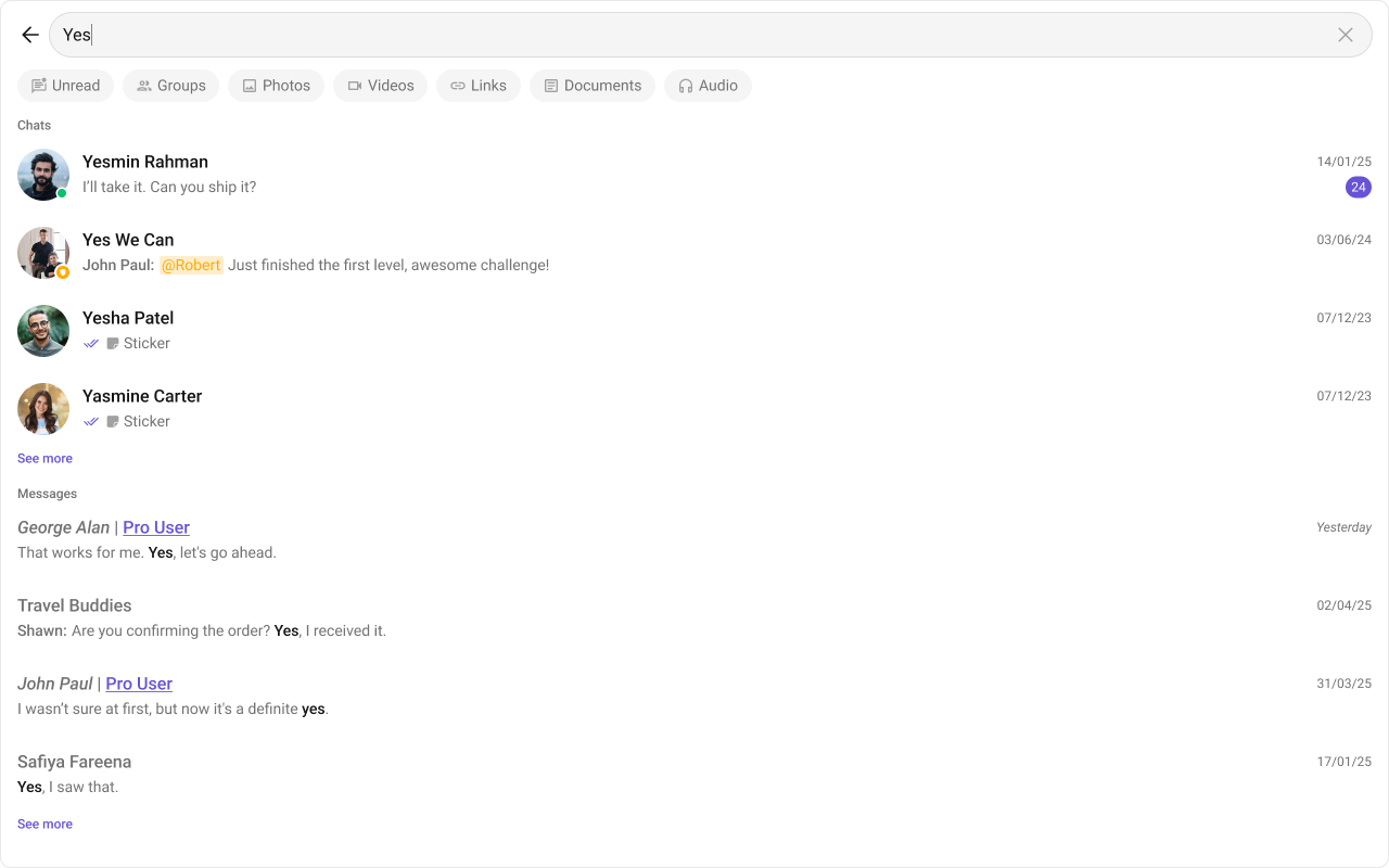 Search FiltersList of filters to be rendered in the Search component.searchFilters={[CometChatSearchFilter.Messages, CometChatSearchFilter.Photos, CometChatSearchFilter.Audio, CometChatSearchFilter.Documents]}
